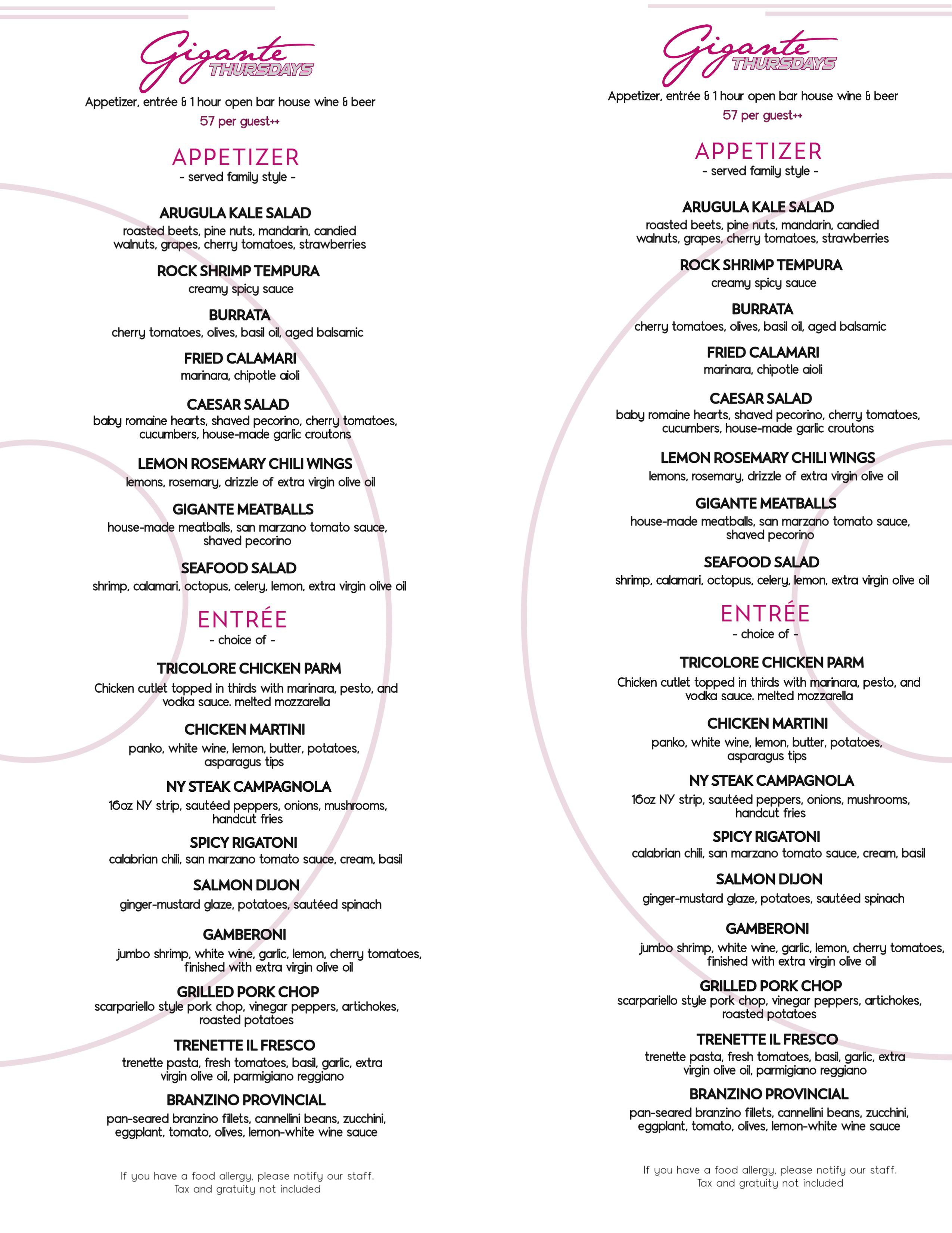 Discover a Sunday brunch like no other at Gigante, where an elegant array of flavors awaits. Begin with our Mediterranean antipasto spread, featuring fresh shrimp cocktail, smoked salmon, mozzarella, and vibrant salads. At the heart of the experience, our chef-led live stations offer prime rib and spiral ham carved precisely to your taste, along with custom omelets crafted right before you.